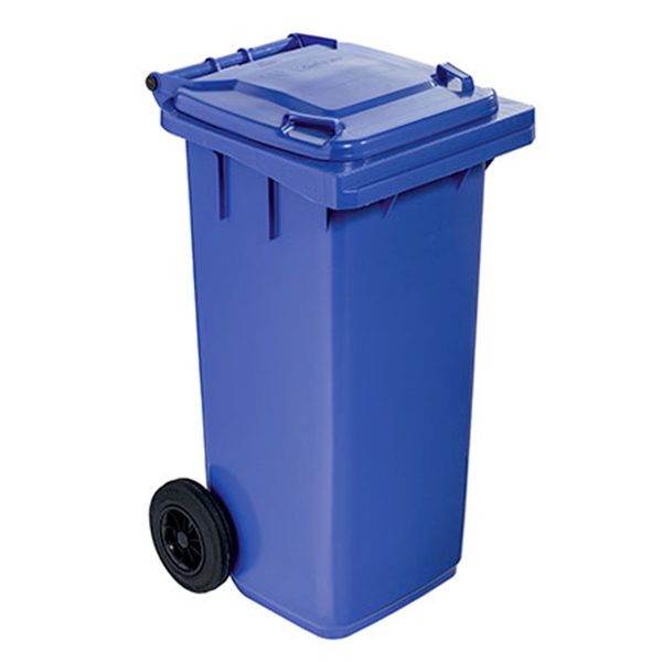 Contenitore due ruote blu. Prodotto senza l’utilizzo di materiale rigenerato; assorbe gli urti resiste ai prodotti chimici e ai grandi sbalzi termici; larga impugnatura del coperchio; ruote in gomma Ø 200 mm, portata 100 kg / ruota; fermo posteriore; gommini per una chiusura silenziosa; pedale in opzione solo per 120 lt; conforme alla norma DIN 30700 / EN 840; anello fermasacco in opzione per 120 lt. Capienza 120 litri