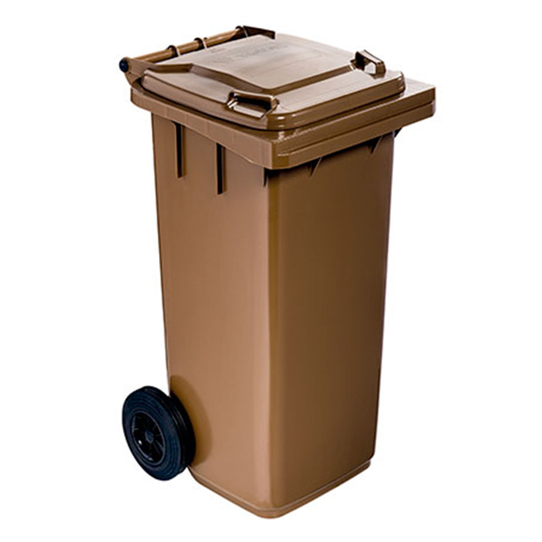 Contenitore due ruote marrone. Prodotto senza l’utilizzo di materiale rigenerato; assorbe gli urti resiste ai prodotti chimici e ai grandi sbalzi termici; larga impugnatura del coperchio; ruote in gomma Ø 200 mm, portata 100 kg / ruota; fermo posteriore; gommini per una chiusura silenziosa; pedale in opzione solo per 120 lt; conforme alla norma DIN 30700 / EN 840; anello fermasacco in opzione per 120 lt. Capienza 120 litri