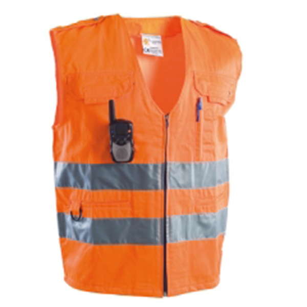 Gilet alta visibilità multitasche. Bande rifrangenti certificate per 50 lavaggi. Cerniera centrale. Spalline portagradi con bottone a pressione. Due Tasche superiori a filetto protette da pattina chiuse da cerniera e velcro. Due Tasche inferiori a filetto. Portapenne al petto. Alamari portaocchiali al petto. Alamaro portapaletta. Norma di riferimento: UNI EN 13688:2013, UNI EN 20471: 2013. Tessuto: poliestere 35%, cotone 65%, peso 210 gr/mq.