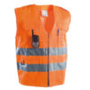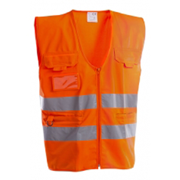 Gilet alta visibilità portabadge arancio. Chiusura centrale con cerniera, portabadge staccabile al petto, due tasche al petto chiuse con pattina e velcro, due tasche inferiori chiuse con cerniera, anello portachiavi sulla tasca inferiore destra. Tessuto: 100% poliestere, 120 gr/mq. Normativa: UNI EN 20471:2013 classe 2.