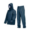 Impermeabile completo giacca pantalone verde. GIACCA: cappuccio fisso, aerazione sul dorso e sotto le ascelle, chiusura con cerniera in plastica con patta e bottoni, maniche con soffietto controvento, due tasche con pattina antipioggia. PANTALONE: elastico in vita, apertura davanti con bottone e flap, tasca passamano, bottone al fondo. Composizione: PVC/Poliestere/PVC. Colore: Verde