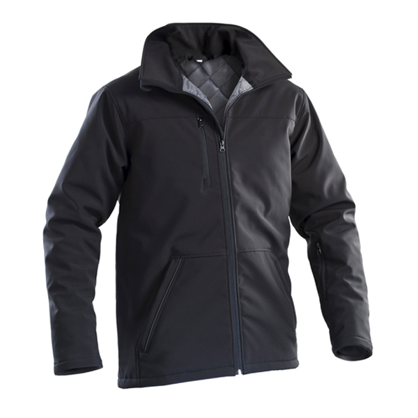 Soft Shell imbottito con cappuccio. Una tasca al petto chiusa con cerniera, due tasche inferiori chiuse con cerniera, una tasca sulla manica chiusa con cerniera, una tasca interna, coulisse con fermacorda sul fondo, coda di topo riflettente sulle tasche inferiori e sulle spalle. Polsini elastici antivento in Lycra. Tessuto: 3 strati, 94% poliestere, 6% spandex. Membrana interna TPU W/P: 8000 mm, MVP: 800 mm. Imbottitura: poliestere 140 gr/mq. UNI EN 13688:2013. Colore: Nero